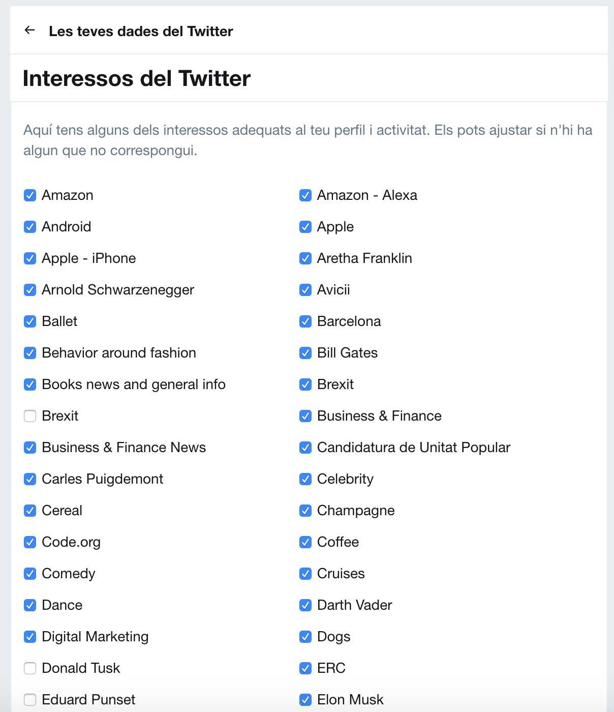 En el meu cas, algun dels meus interessos segons Twitter, es poden veure en aquesta pantalla.